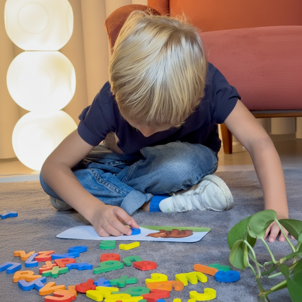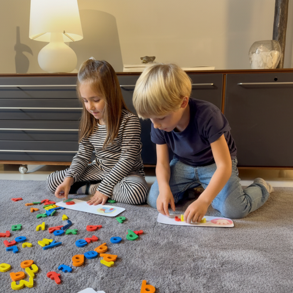 Con questo gioco esplorano le letterine in legno, associano immagini e parole e memorizzano le prime letture in modo naturale. Le schede colorate li guidano passo dopo passo, trasformando il gioco in apprendimento.