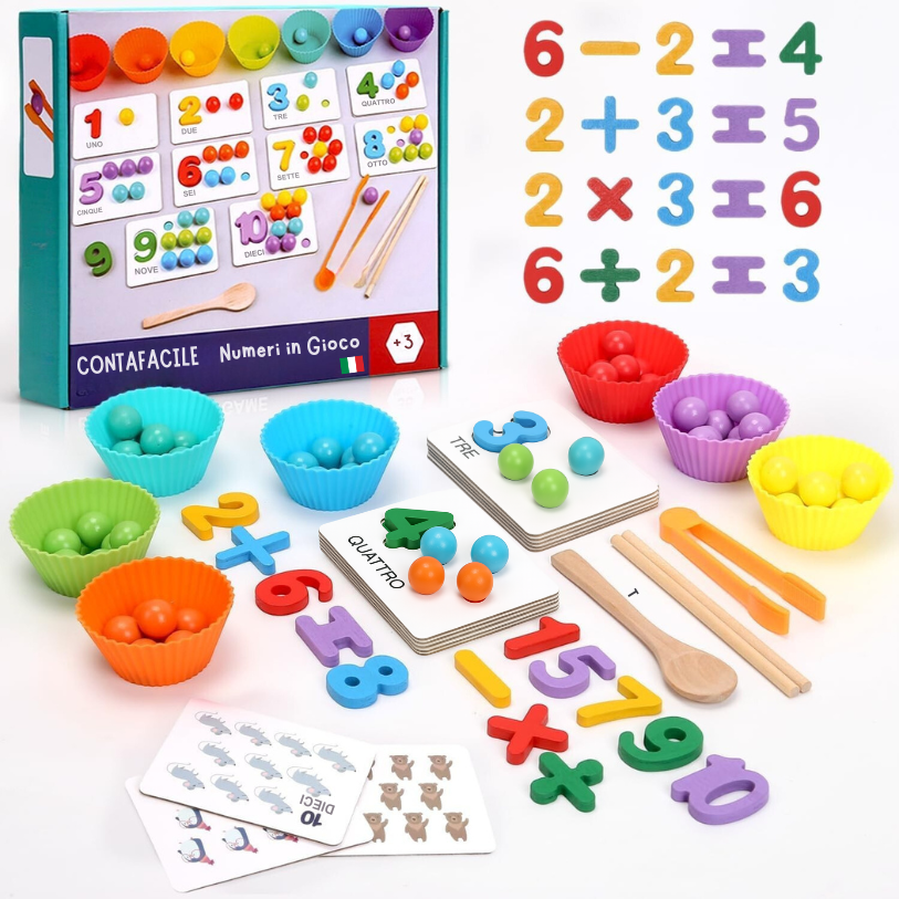Colori, numeri e manualità diventano un’avventura pratica e stimolante: mentre conta, abbina e ordina le palline colorate, trasforma concetti astratti in un gioco concreto e appassionante.